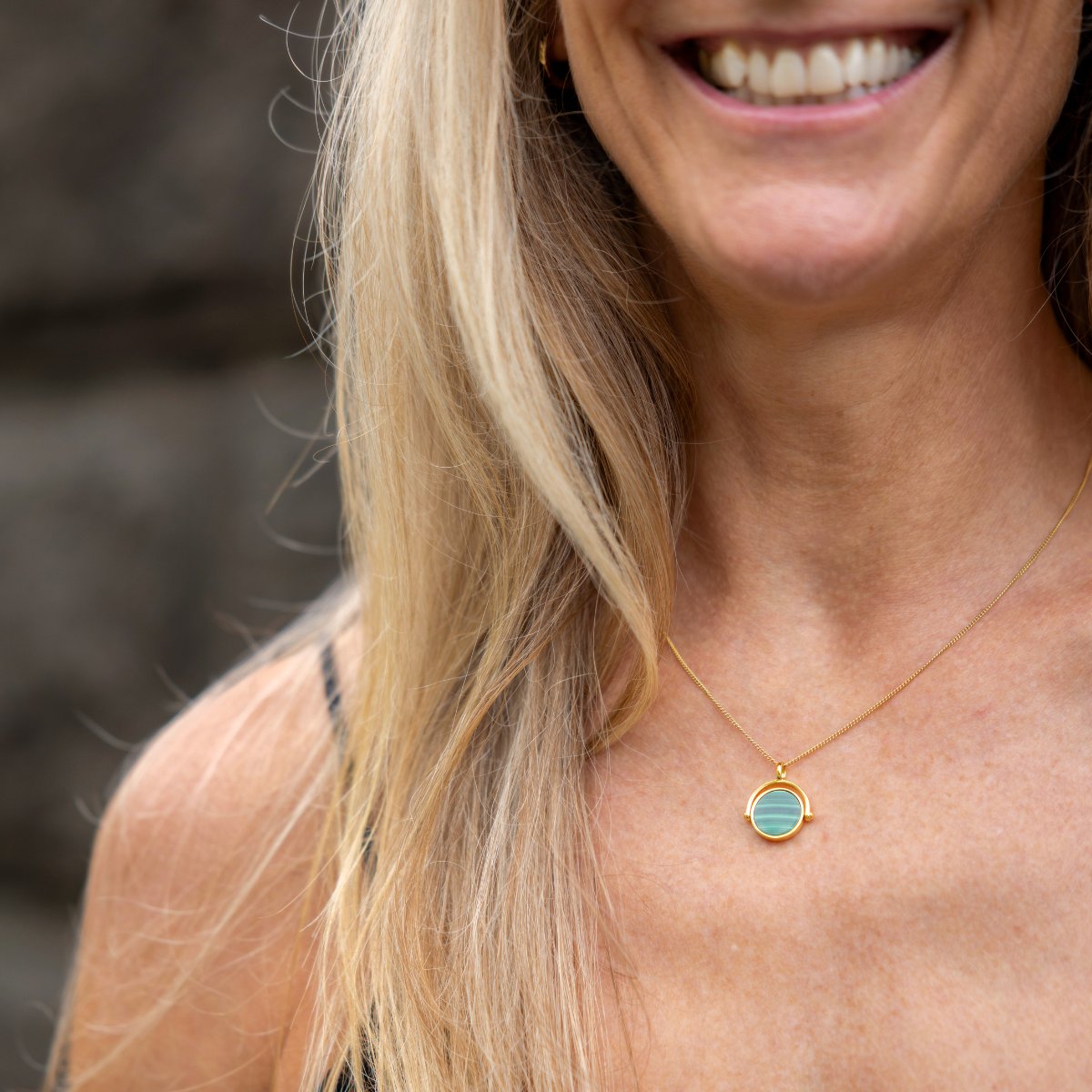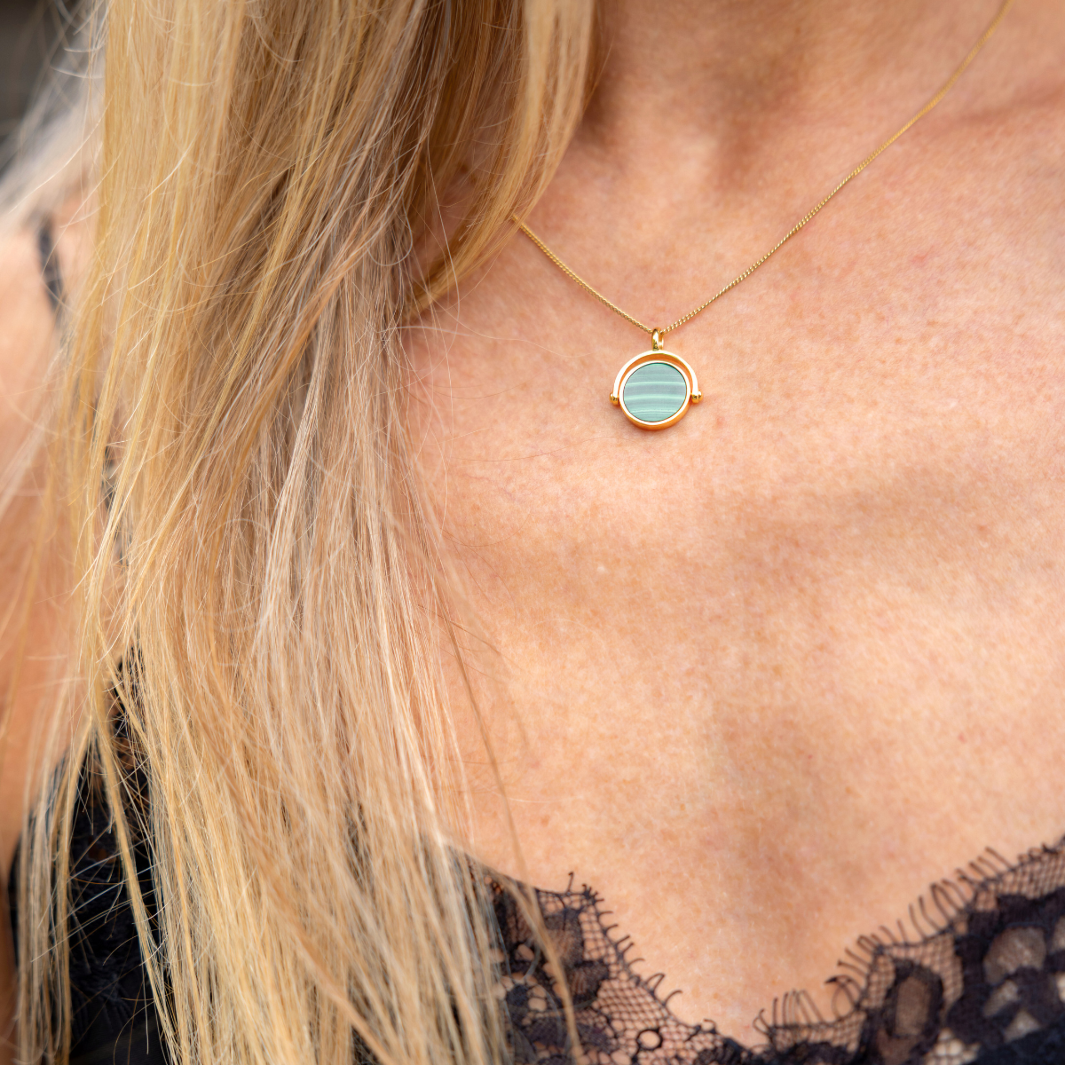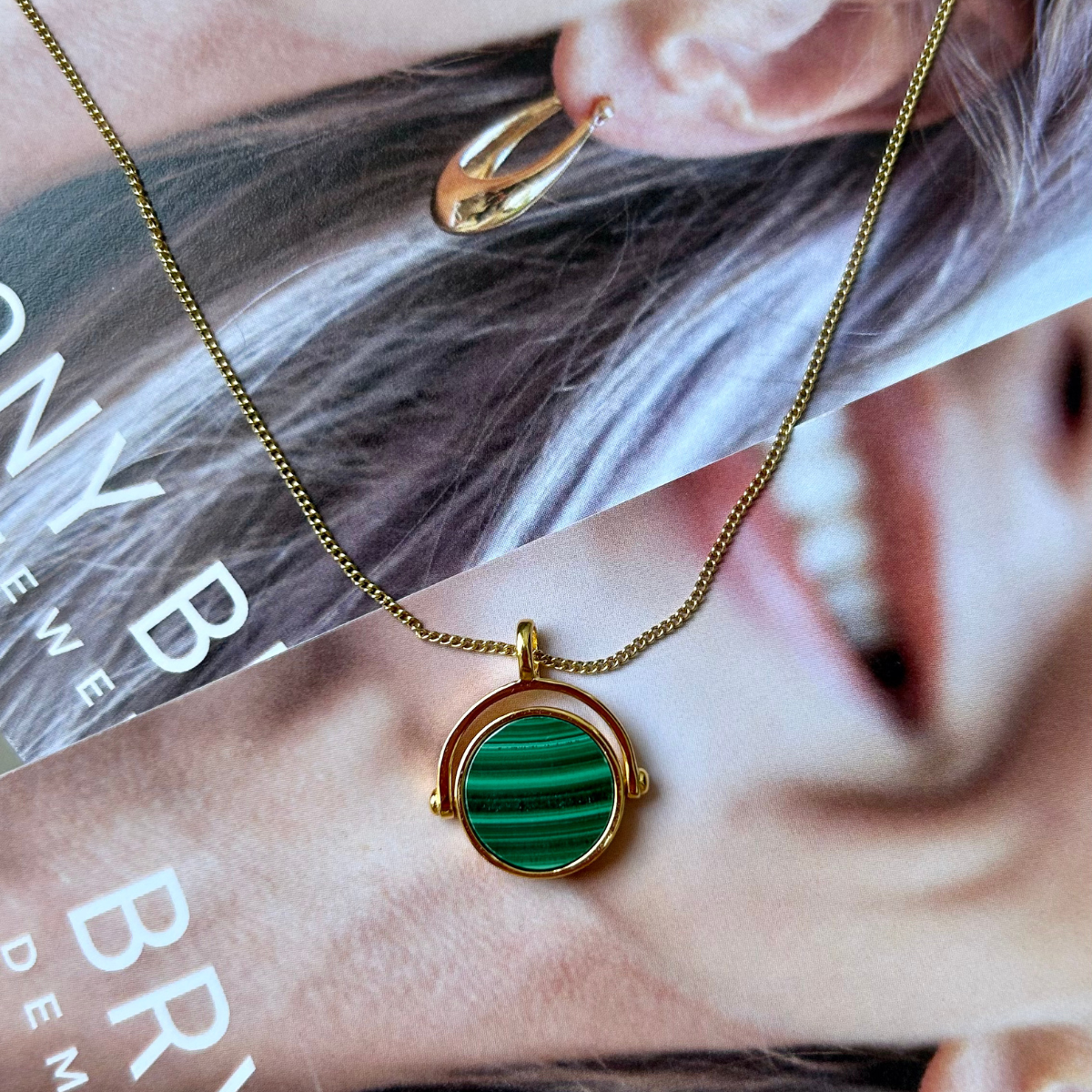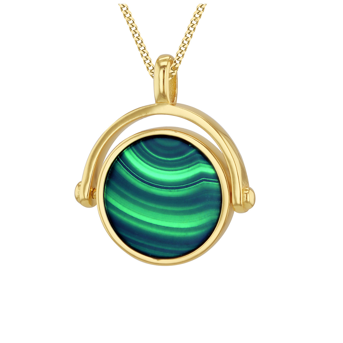 Our Adria spinner pendant features a striking disc of semi-precious malachite set in gold vermeil. Known for its grounding energy, malachite adds a bold, earthy feel to your look. The spinning design brings a playful, calming touch, ideal for anyone who loves their jewellery with a little movement.