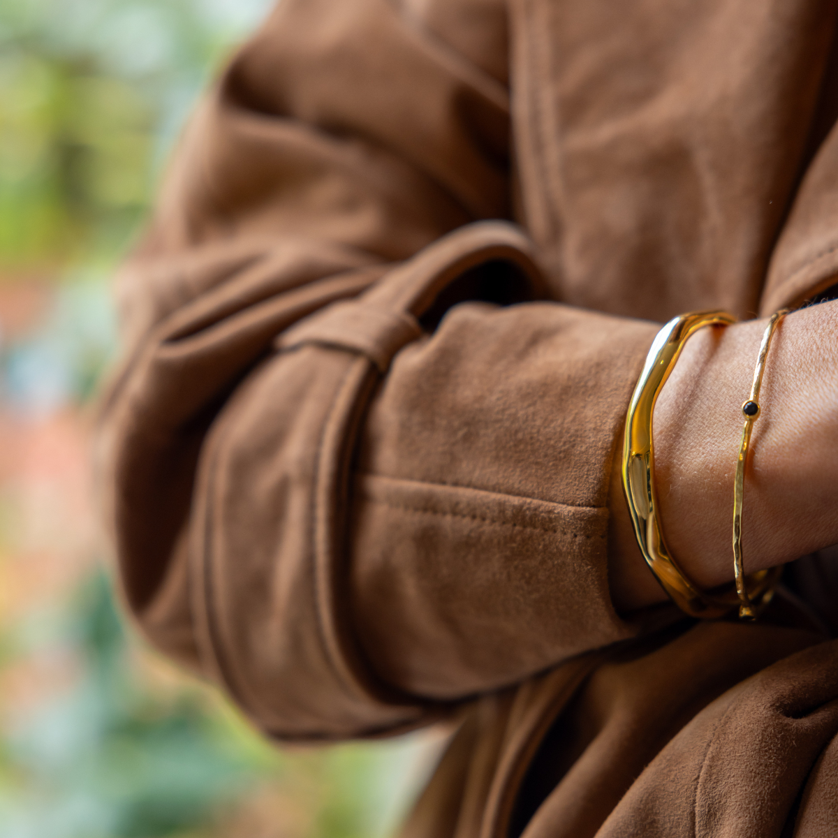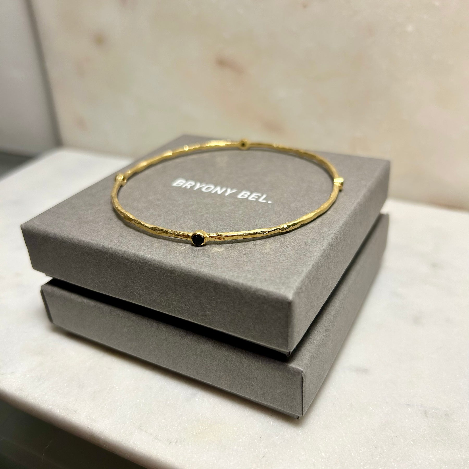 Add a splash of colour to your style with this chic hammered bangle featuring round semi-precious green onyx stones set along its perimeter. Whether you're dressing up or adding a touch of flair to your everyday look, this bangle is the perfect piece.