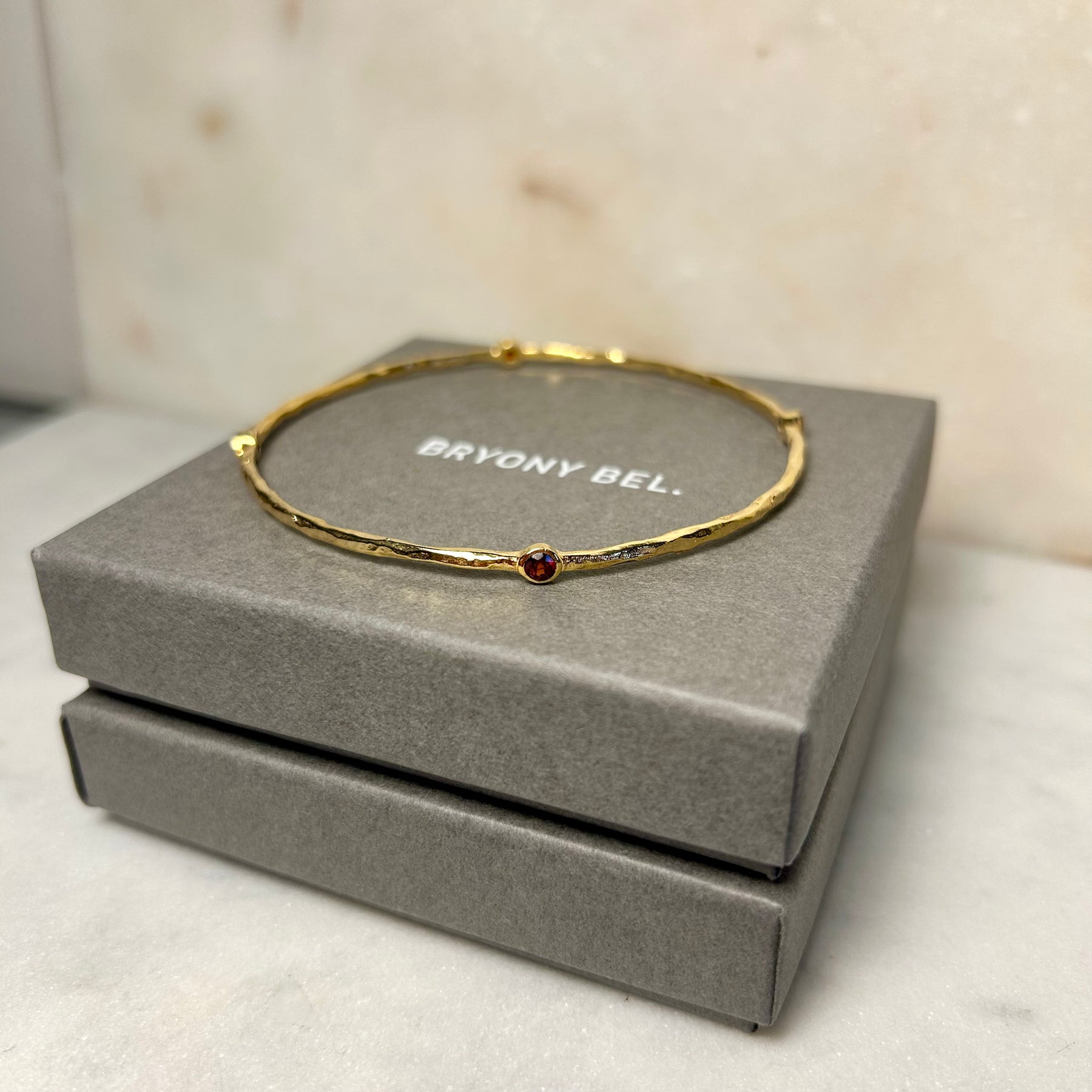 Add a pop of colour to your wrist stack with this chic hammered bangle featuring four round semi-precious pink sillimanite stones set along its perimeter.