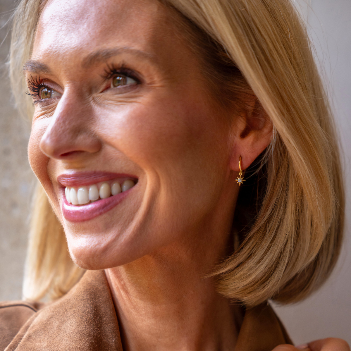 Bang on-trend celestial huggie hoop earrings featuring delicate sparkling star charms with clear crystals that catch the light beautifully.